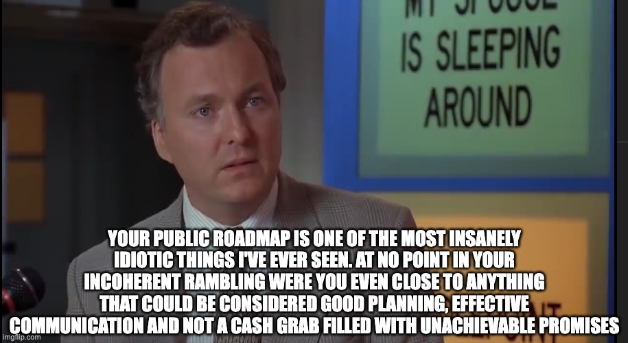 - If you need to adjust the roadmap (like every startup ever has to all the time) you create a ton of bad PR and additional distractions for the team as people cry about it on twitter and in your discord even if you give valid reasons as to why